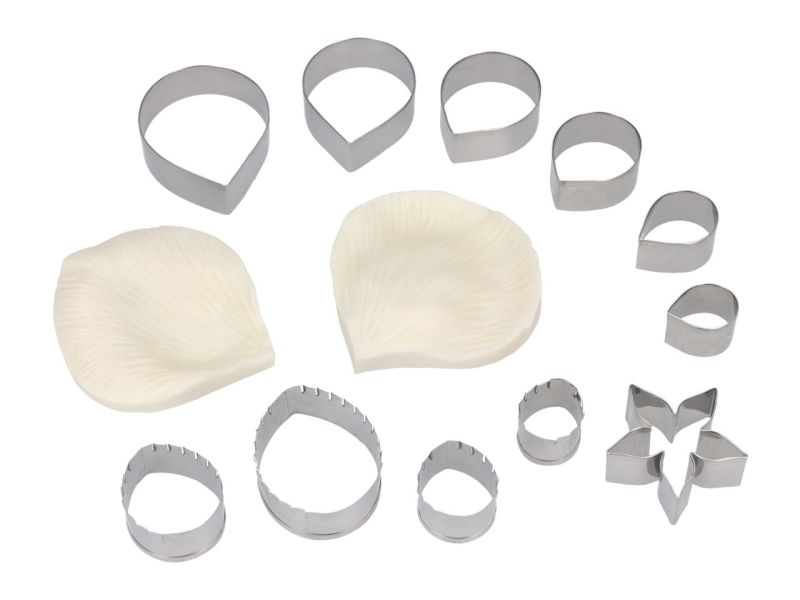 - на резците за венчелистчета: 6,0 см / 5,0 см; 5,2 см/ 4,2 см; 4,5 см/ 3,8 см, 4,0 см/ 3,0 см, 3,2 см/ 2,5 см; 2,5 см/ 2,0 см