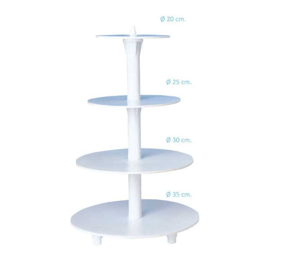 Бяла пластмасова стойка за торта, която е здрава и стабилна, но и лека: идеална за представяне на любимите ви торти и лакомства по специални поводи. Поставката за торта се сглобява бързо и лесно, а централната колона осигурява допълнителна стабилност. Използваните материали са безопасни за контакт с храни. Добавете допълнителен декоративен щрих от волани, или панделки на всяко ниво, за да изпъкнат още повече вашите вкусни творения. Перфектен, семпъл дизайн както за солени, така и за сладки изкушения, подходящ за всяко тържество.